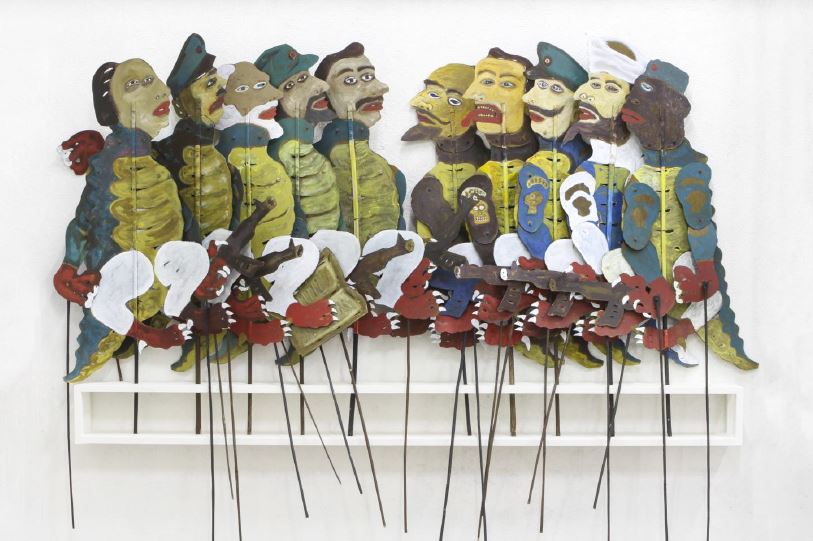 Wayang Re-PLAY – 2014, mixed media, acrylic on paper, fiber, wood, Installation, 230 x 145 x 15 cm, Edition #1 of 3
