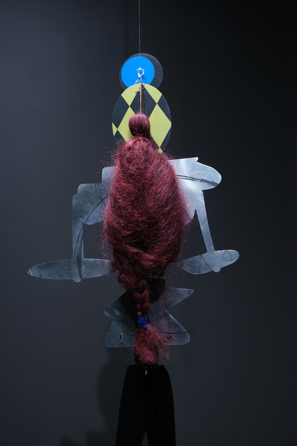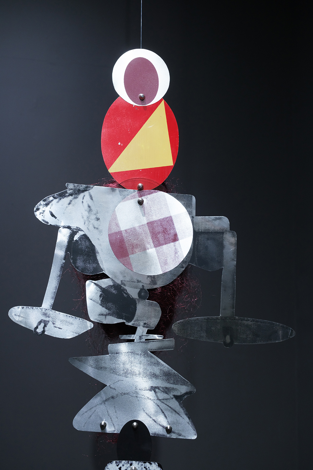Self Portrait (detail) – 2017, partly printed on and custom cut metal sheet, readymade textile, artificial hair, painted cardboard, wire, plastic tube