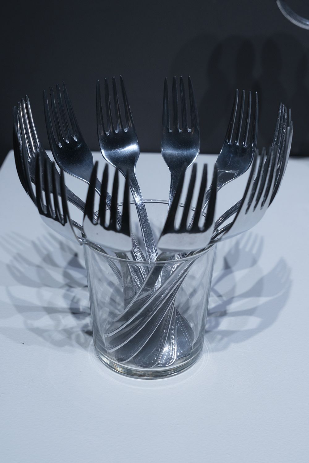 Still Life (Bouquet of Forks) – 2021, polished aluminum casts of 12 forks, made of melted coins, collected from the Balinese sacred fountains, glass, H 16 x D 18 cm, Edition of 5 + 2 AP