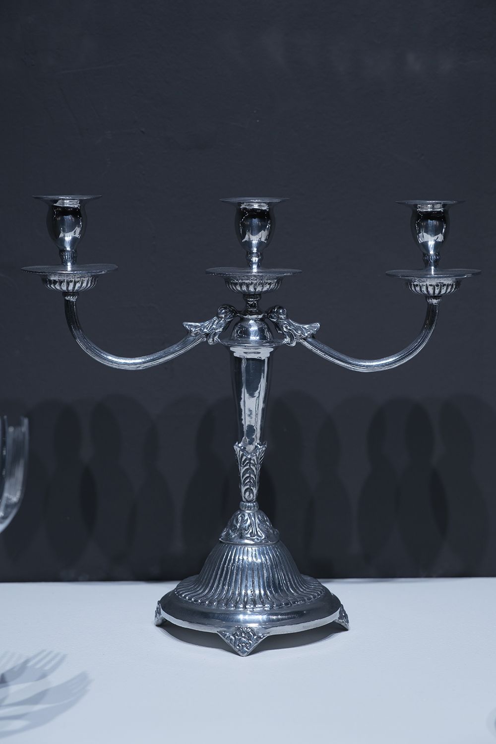 Still Life (Jug, Mirror, Candelabra, Forks) – 2021, polished aluminum casts of a jug, mirror, candelabra and 12 forks, made of melted coins, collected from the Balinese sacred fountains, glass, H 32 x W 96 x D 48 cm, Special Edition + 1 AP