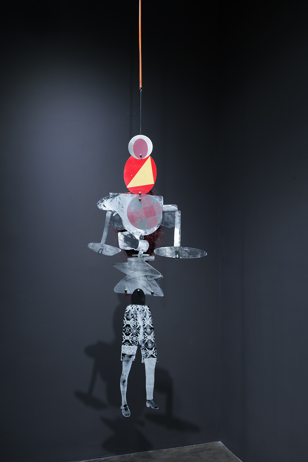 Self Portrait – 2017, partly printed on and custom cut metal sheet, readymade textile, painted cardboard, wire, plastic tube
