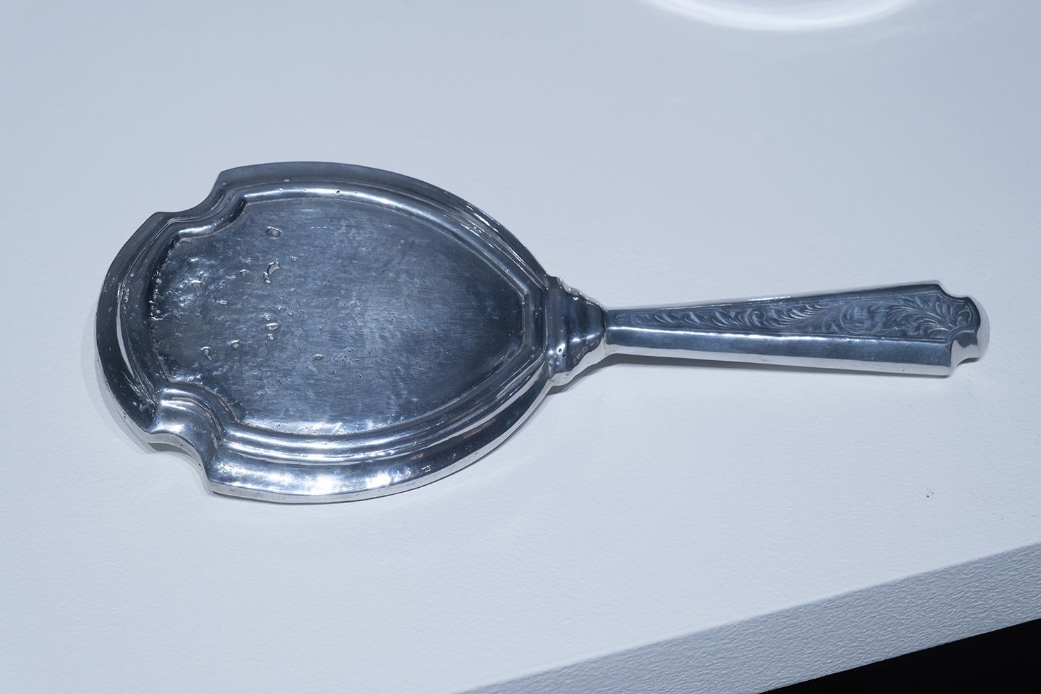 Still Life (Mirror) – 2021, polished aluminum cast of a mirror, made of melted coins, collected from the Balinese sacred fountains, H 12 x W 29 x D 2,5 cm, Edition of 3 + 2 AP