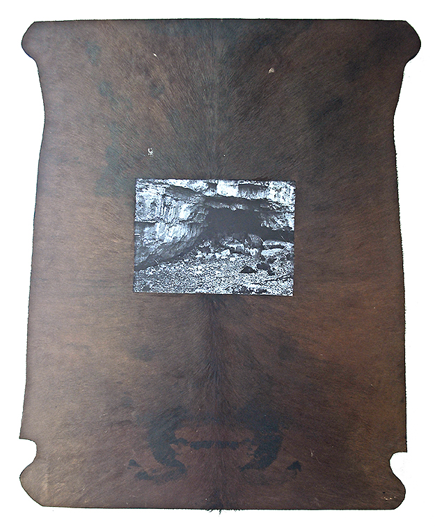 Plato's Cave, 2014, oil on paper mounted on cow skin on wood, 126 x 100 cm