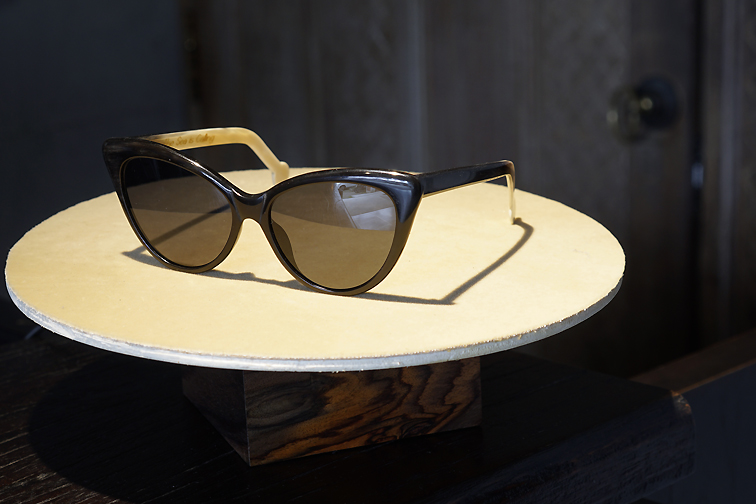 Mata Hari (The Sea is Calling), 2016, handcrafted horn sunglasses, engraved on inside right wing "The Sea is Calling", presented on revolving plate, 15,5 x 5 x 14 cm