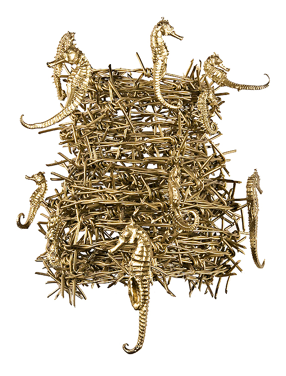 Gremano Esiatico # 35, 2014, oil paint on iron and real sea horses, 33 x 27 x 22 cm