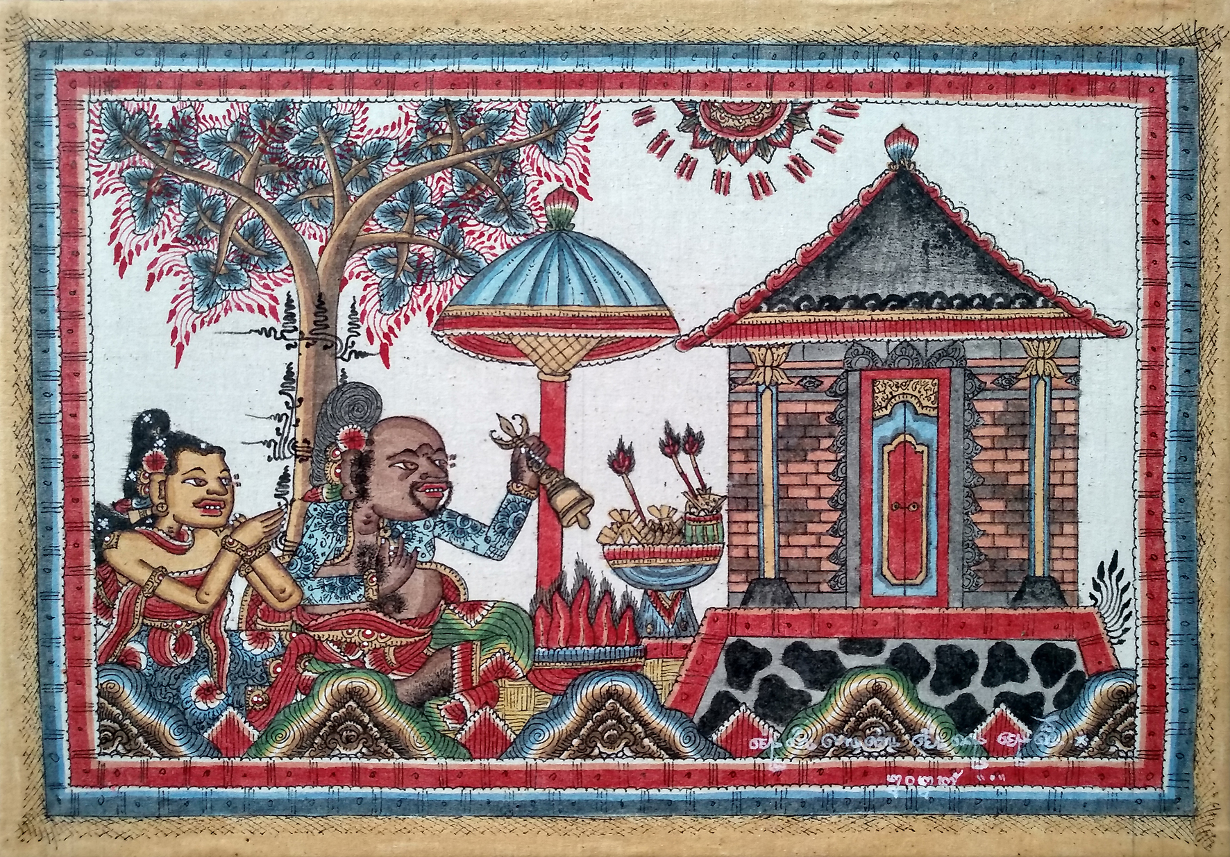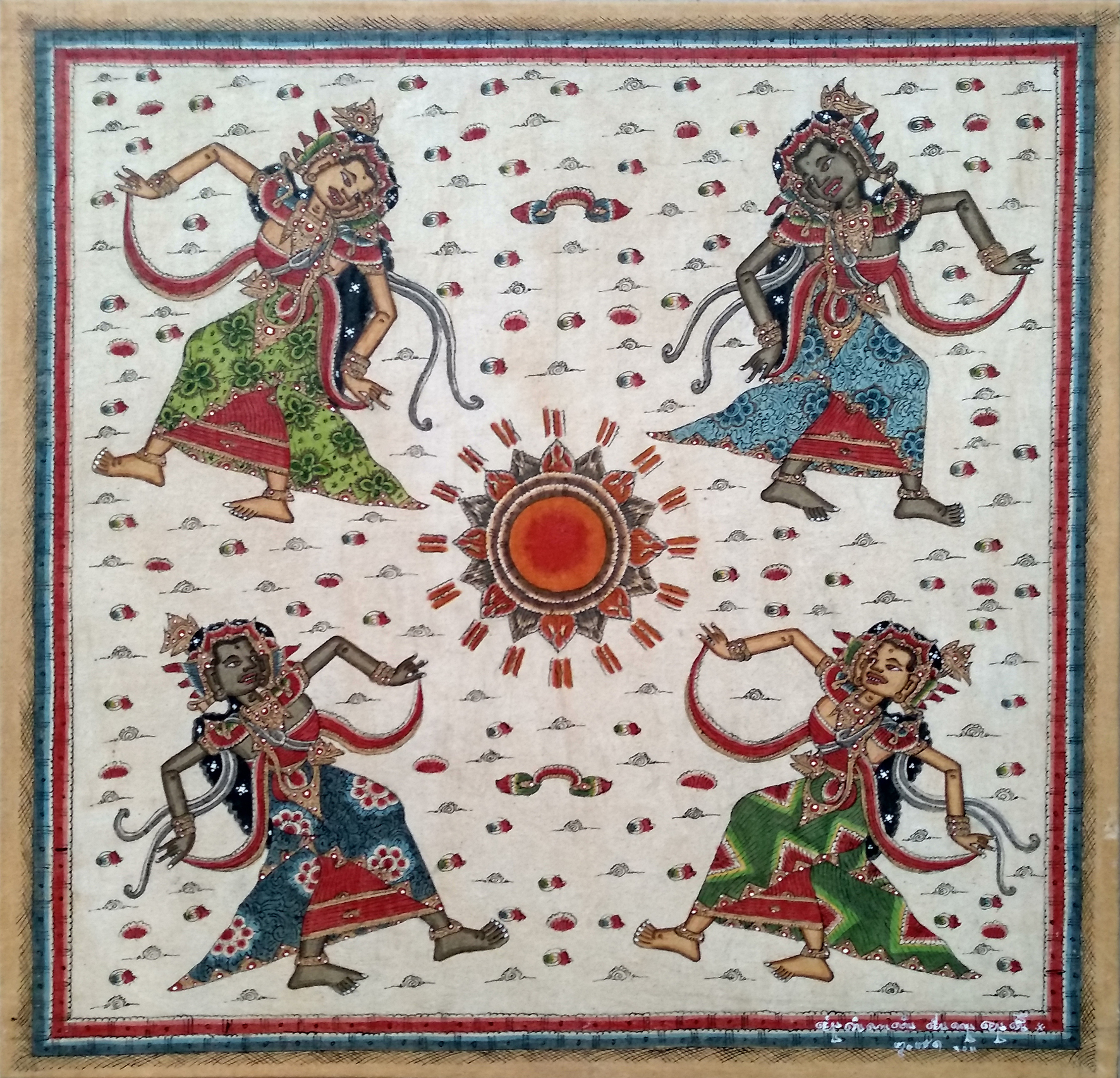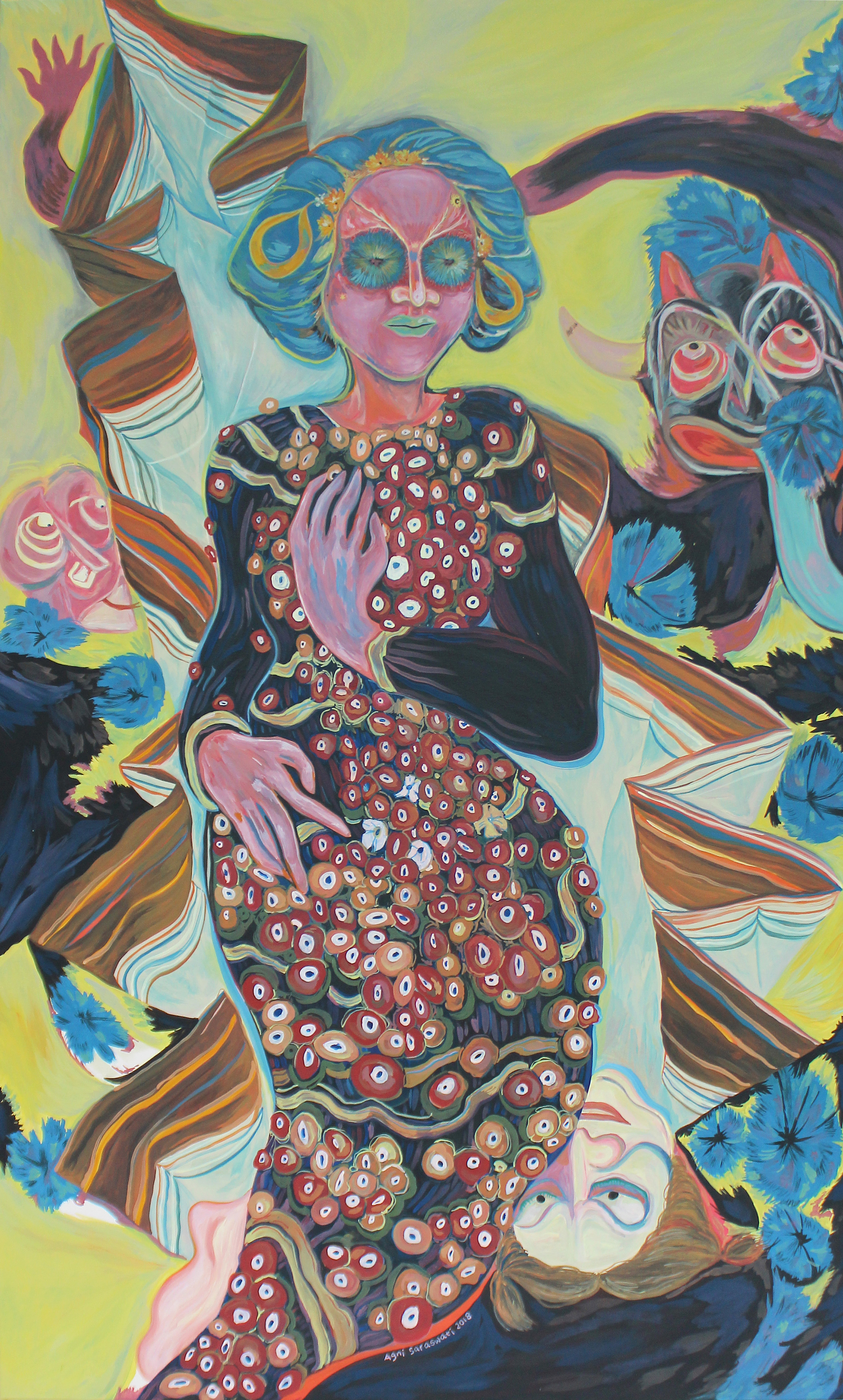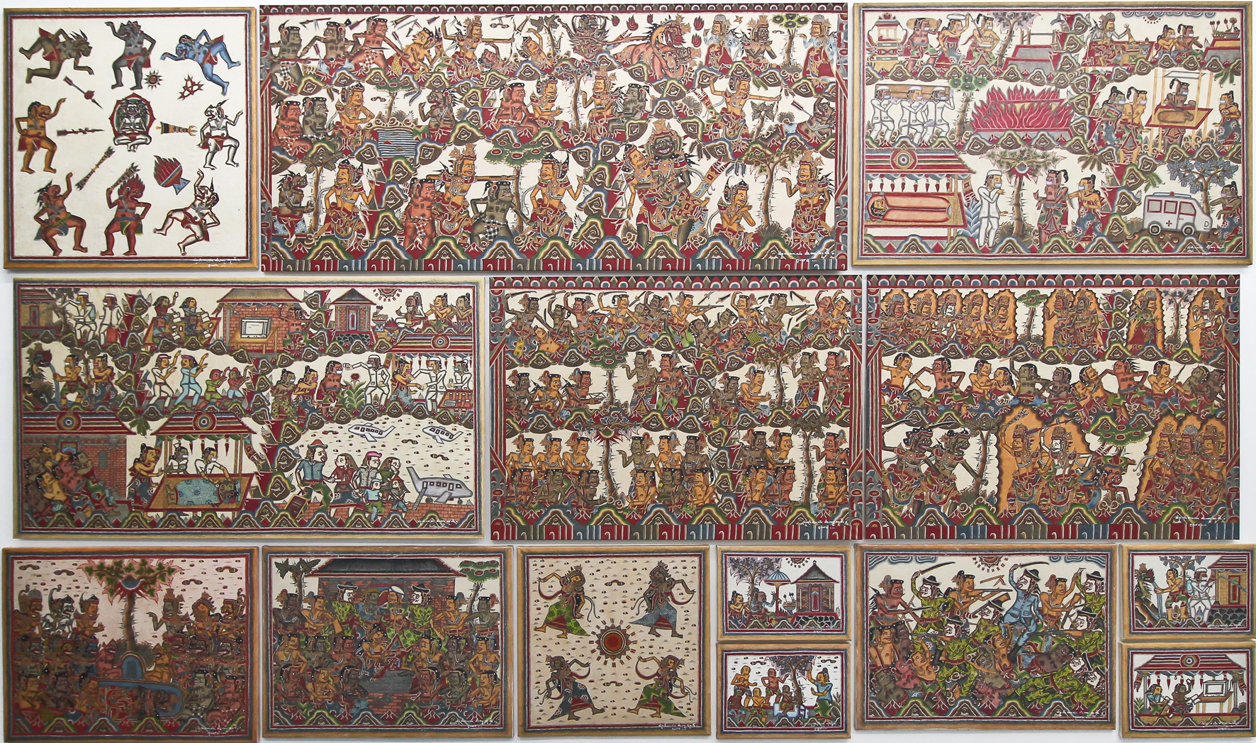 Guardians of the Nine Directions, 2015 // The Tale of Knight Sumantri, 2014 // Covid-19 (Cremation), 2021 // Covid-19 #1, 2021 // The Mahabharata War of the 21st Century, 2015 // Kala Sungsang – The Upside Down Demon, 2015 // Ramayana (The Fall of Rahwana), 2017 // The Arrest of Prince Diponegoro, 2015 (Private Collection Bali) // Moon People, 2015 // Self Portrait (priestess), 2021 // Self Portrait (cousins), 2021 // Perang Kusamba – The Third Balinese War (Private Collection Bali) // Covid-19 (Fragment #2), 2021 // Covid-19 (Fragment #3), 2021