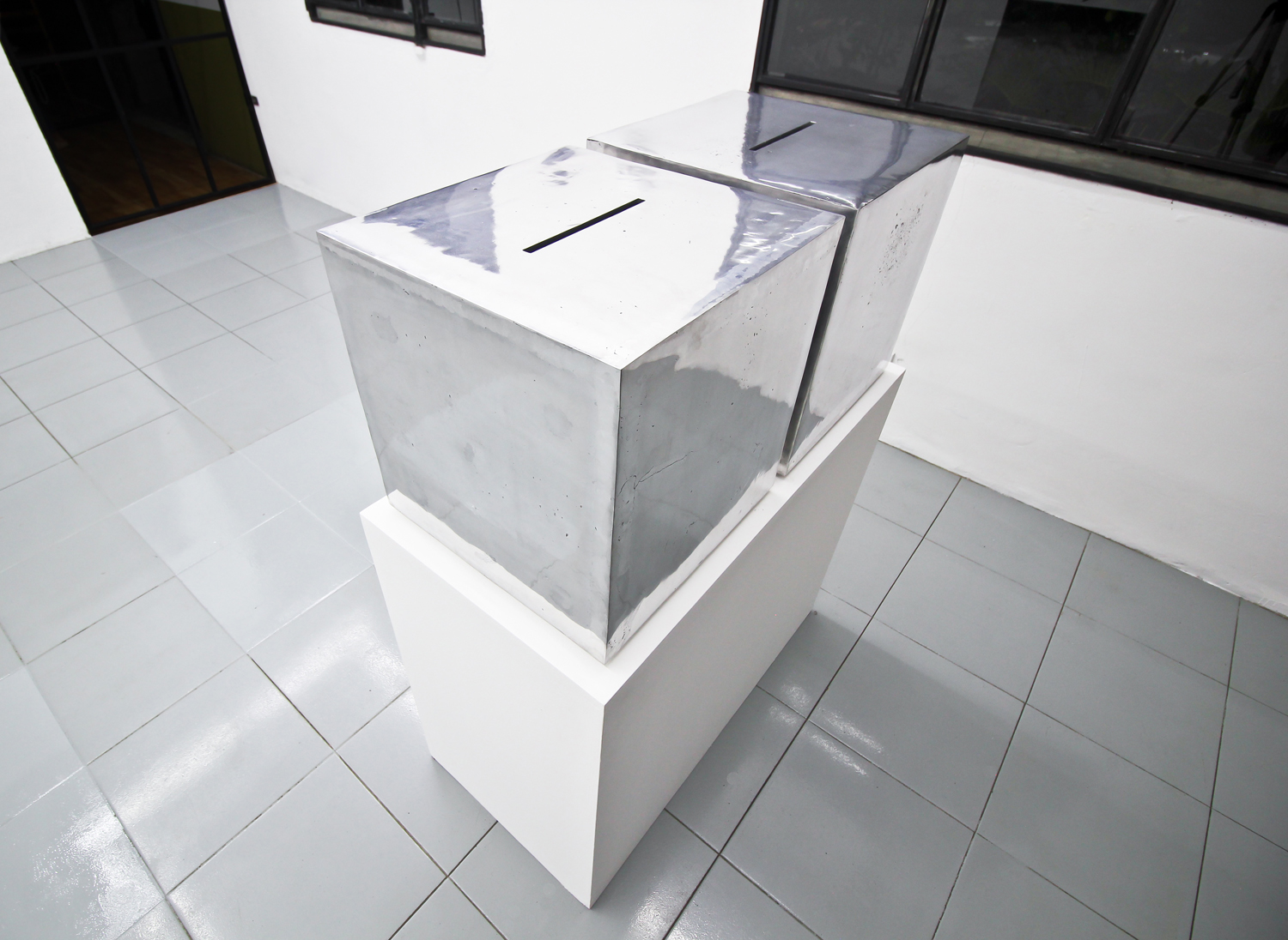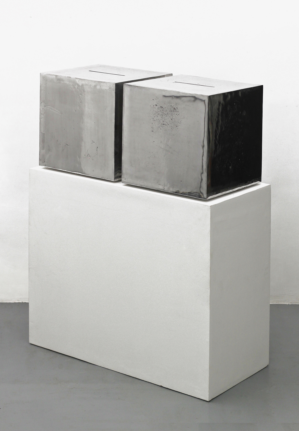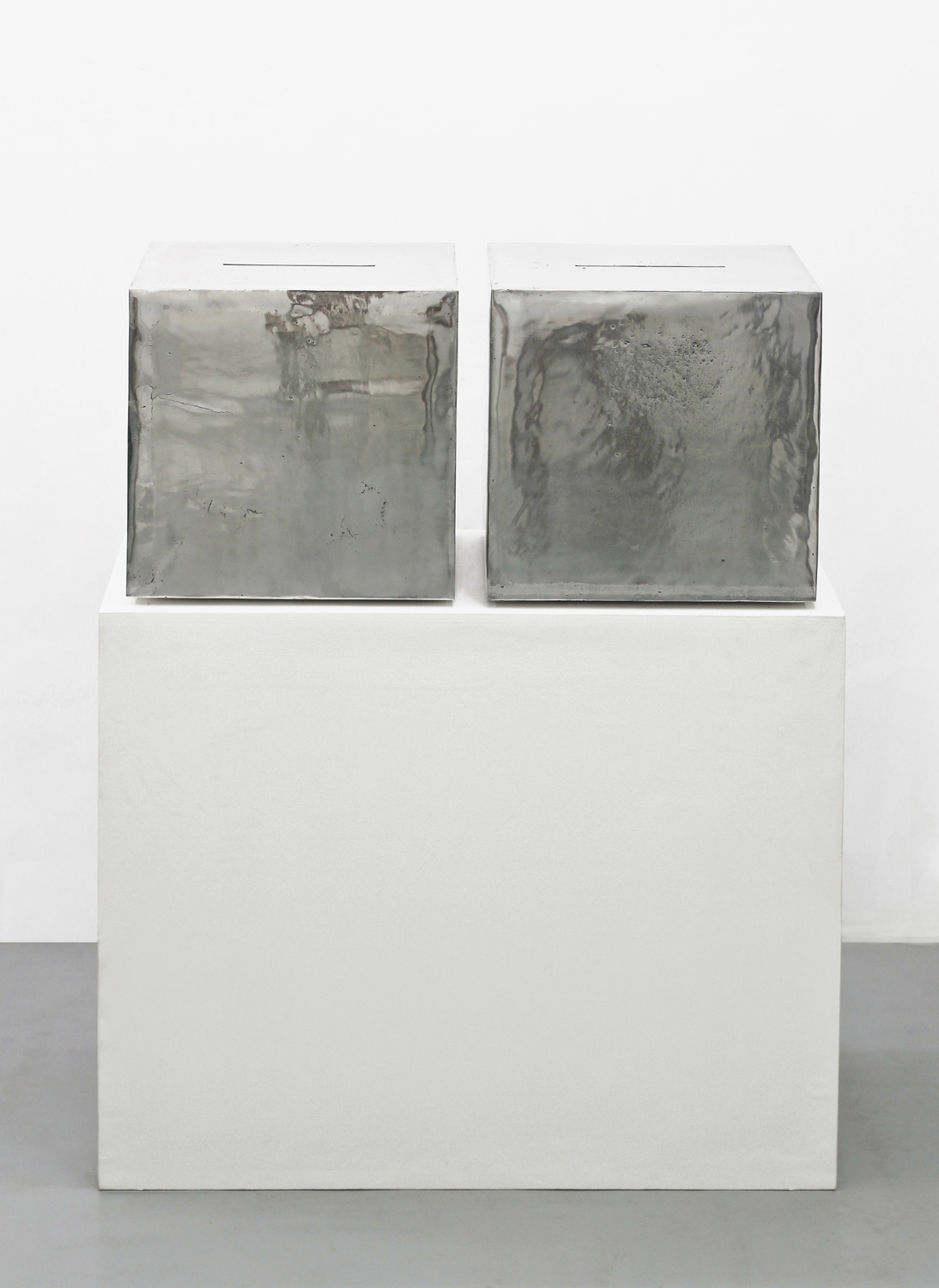 Inseparable Two (Loro Blonyo), 2021-22, set of polished aluminum wishboxes made of melted coins from various countries, W 42,5 x D 42,5 x H 42,5 cm each, W 96 x D 48 x H 124 cm (including base)
