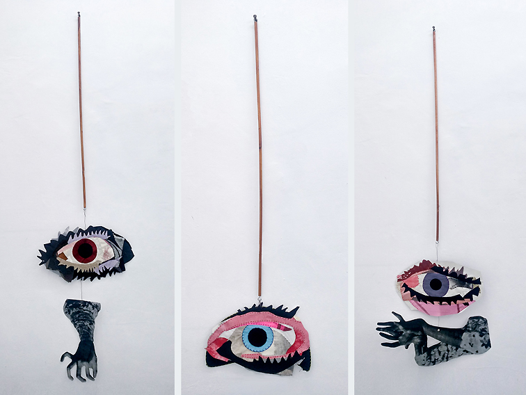 Untitled (Eyes Bali) – 2019, 3 individual puppets, partly printed on and custom cut metal sheet, custom made embroidery, wire, wooden sticks