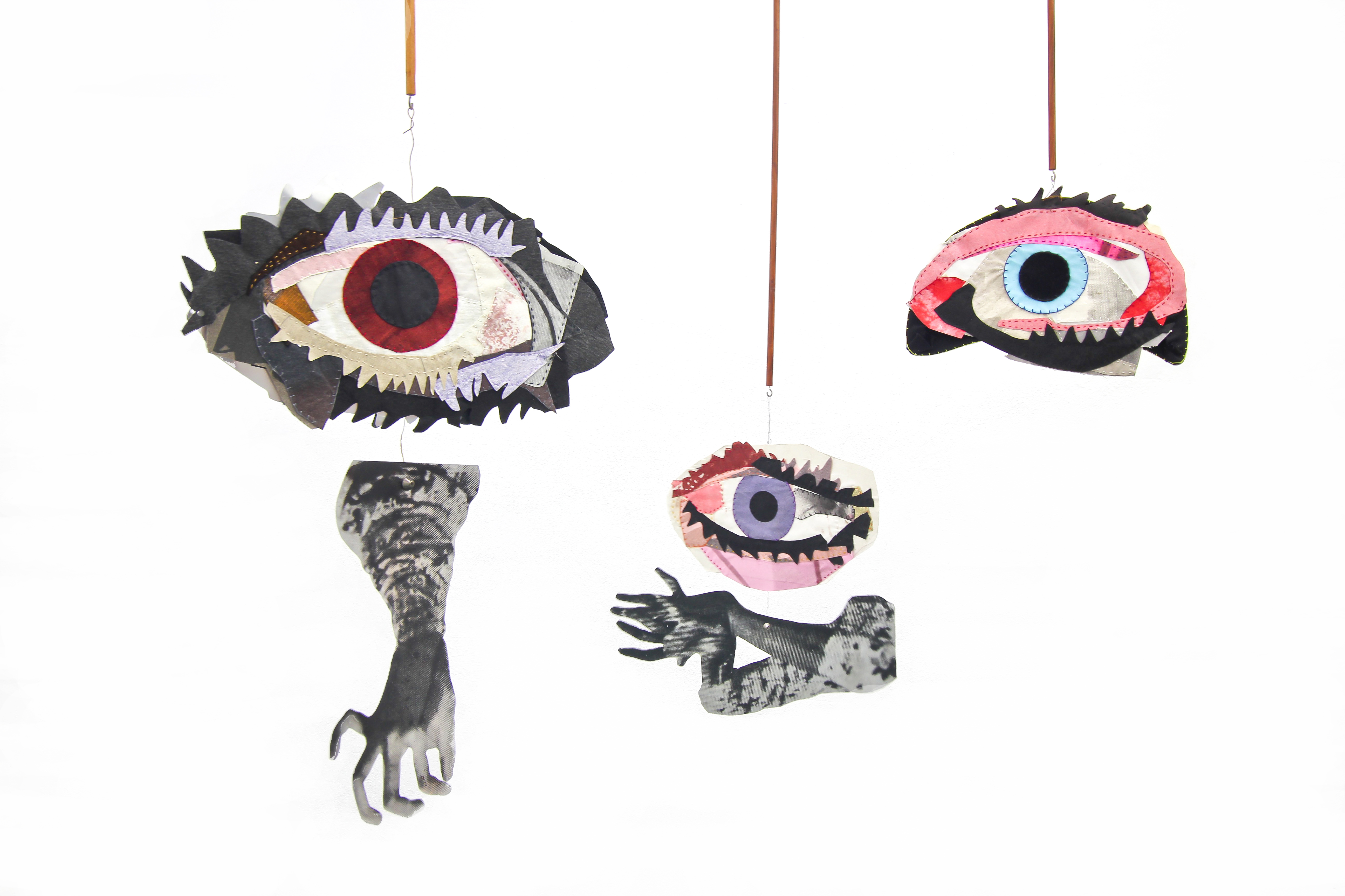 Untitled (Eyes Bali) – 2019, 3 individual puppets, partly printed on and custom cut metal sheet, embroidery, wire, wooden sticks